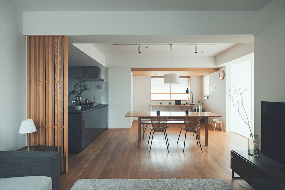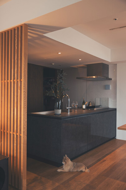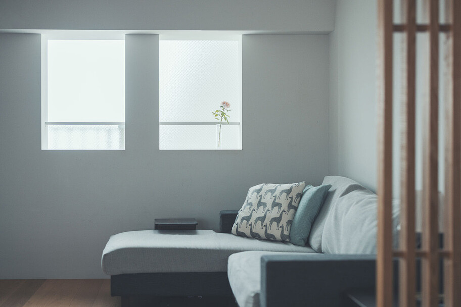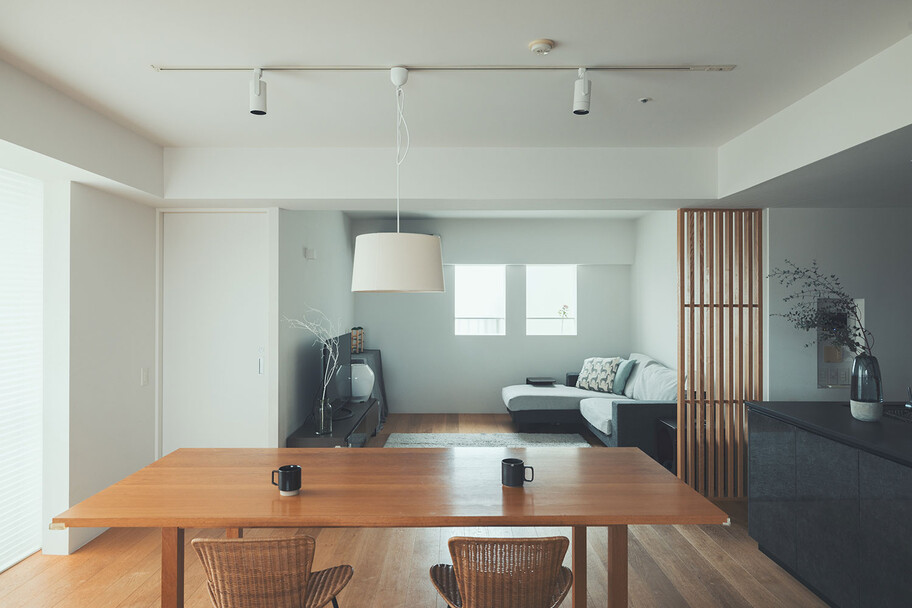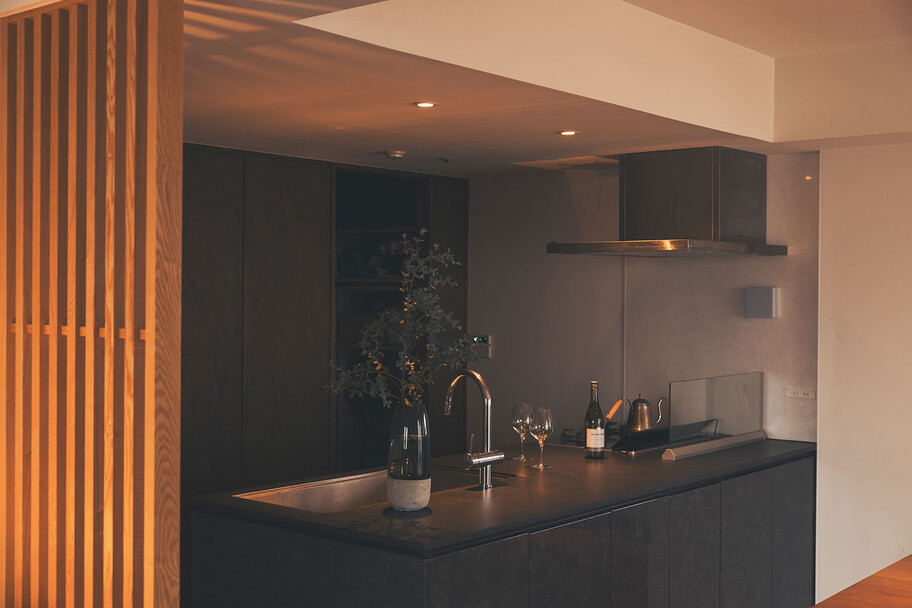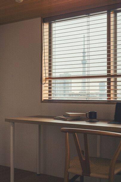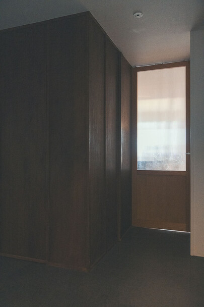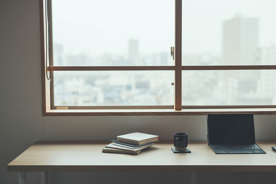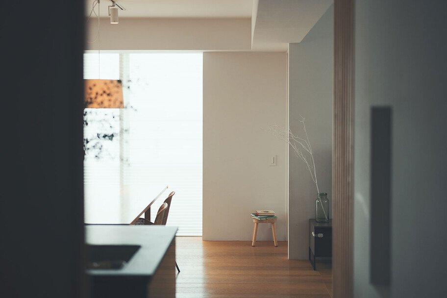 計画住戸は北東西の三面に窓を持つ恵まれた間取りであり、高層階のため眺望も良い。そこで窓廻りを中心にデザインすることで、住戸がもつ魅力を惹き出すことにした。枠廻りを造作してアルミサッシ枠を隠す。窓枠の奥行きを深くし陰影を生む。窓枠に手触りの良いナラ無垢材を使う。引違い窓の半分をあえて潰して壁を増やす。そのような幾つかの手法で、窓の大きさやプロポーション、窓と壁のバランスを整えた。住戸が持つ特性を観察し、受け入れて活かすことが、新築とは違ったリノベーションの醍醐味であると考えている。