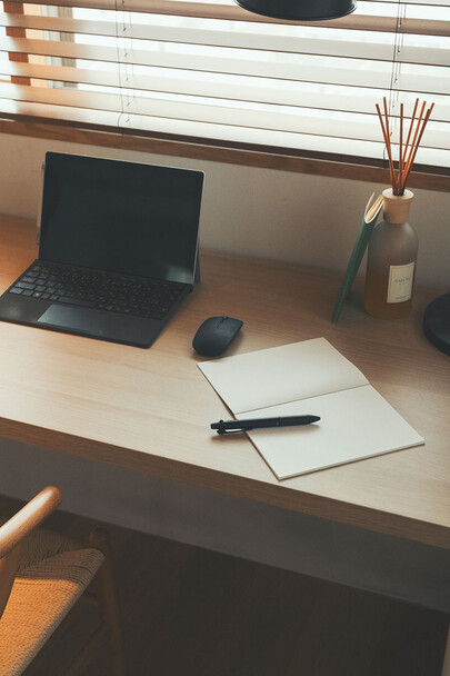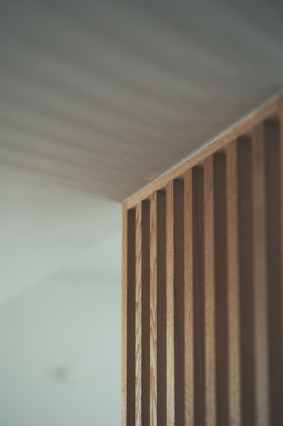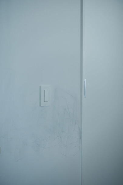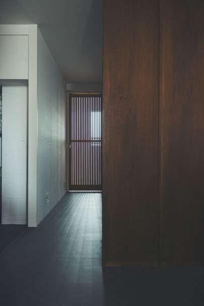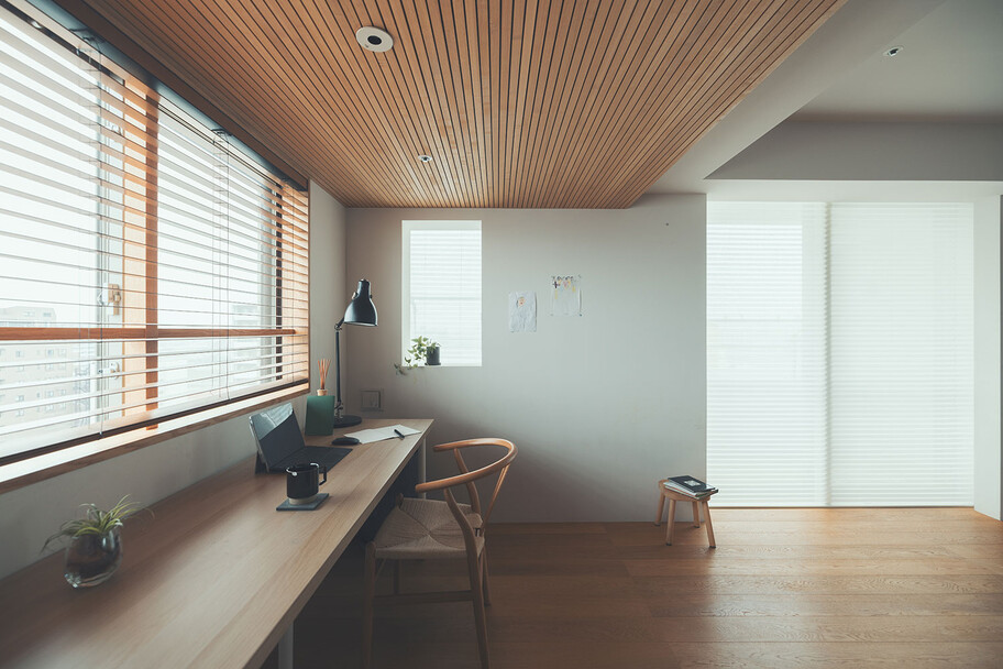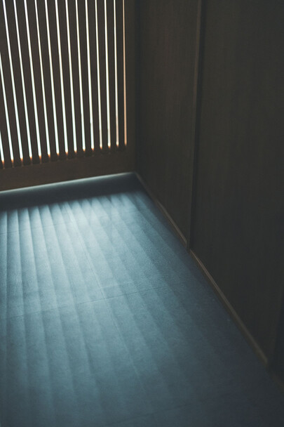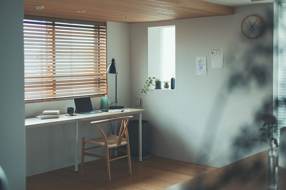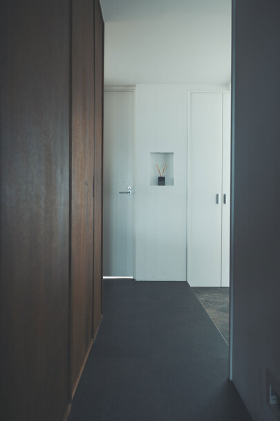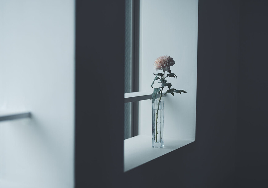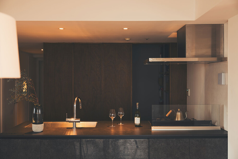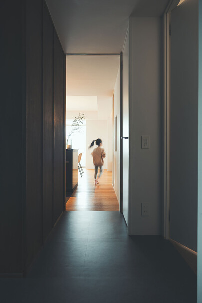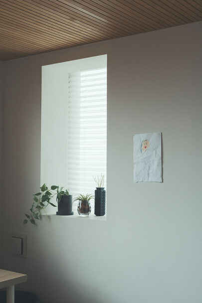 計画住戸は北東西の三面に窓を持つ恵まれた間取りであり、高層階のため眺望も良い。そこで窓廻りを中心にデザインすることで、住戸がもつ魅力を惹き出すことにした。枠廻りを造作してアルミサッシ枠を隠す。窓枠の奥行きを深くし陰影を生む。窓枠に手触りの良いナラ無垢材を使う。引違い窓の半分をあえて潰して壁を増やす。そのような幾つかの手法で、窓の大きさやプロポーション、窓と壁のバランスを整えた。住戸が持つ特性を観察し、受け入れて活かすことが、新築とは違ったリノベーションの醍醐味であると考えている。